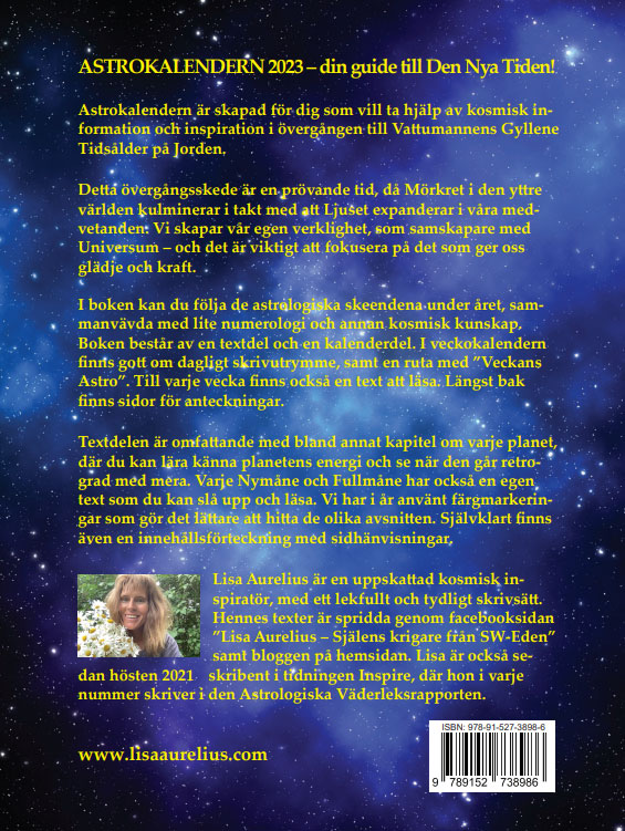 Boken består av en textdel och en kalenderdel och är tänkt att användas som dagbok för din utvecklingsresa. I veckokalendern finns gott om dagligt skrivutrymme där du kan göra noteringar om dina tankar, känslor och upplevelser. Längst bak finns anteckningssidor där du kan skriva mer. På detta sätt kan du följa din egen process och se hur de olika energierna påverkar dig. På varje veckouppslag finns en ruta med ”Veckans Astro”, där du kan se de viktigaste astrologiska händelserna för veckan. Till varje vecka hör också en inspirerande text. Det finns färgmarkeringar på de olika avsnitten i boken, så att det ska gå snabbt och lätt att slå upp det du söker. Boken är försedd med två läsband att lägga som bokmärken. När det exempelvis är Nymåne, slår du upp avsnittet om Nymånarna i de olika stjärntecknen, och läser om den aktuella Nymånens energier. När Merkurius vänder retrograd, slår du upp kapitlet om Retrograd, och kapitlet om Merkurius. När Månen byter tecken, vilket sker varannan till var tredje dag, kan du slå upp avsnittet ”Månens energi i de olika stjärntecknen” och läsa om det stjärntecken det gäller. Du behöver inte ha några förkunskaper om astrologi – boken är skriven på ett förklarande sätt så att du kan läsa dig till det du behöver veta. DIN PERSONLIGA ASTROLOGI I ”Veckans Astro” finns detaljerade uppgifter, för att du ska kunna se hur energierna berör dig personligen. Även gradtalen anges, så att du exempelvis kan se att Månen möter Mars på 17° Väduren. Du kan då se hur detta är relaterat till ditt eget födelsehoroskop. Din astrologiska födelsekarta kan du få kostnadsfritt på internet, sök på ”free horoscope”. OM FÖRFATTAREN Lisa Aurelius är en uppskattad kosmisk inspiratör, med ett lekfullt och tydligt skrivsätt. Hennes texter är spridda genom facebooksidan ”Lisa Aurelius – Själens krigare från SW-Eden” samt bloggen på www.lisaaurelius.com. Lisa är också sedan hösten 2021 skribent i tidningen Inspire, där hon i varje nummer skriver i den Astrologiska Väderleksrapporten. ![]() |